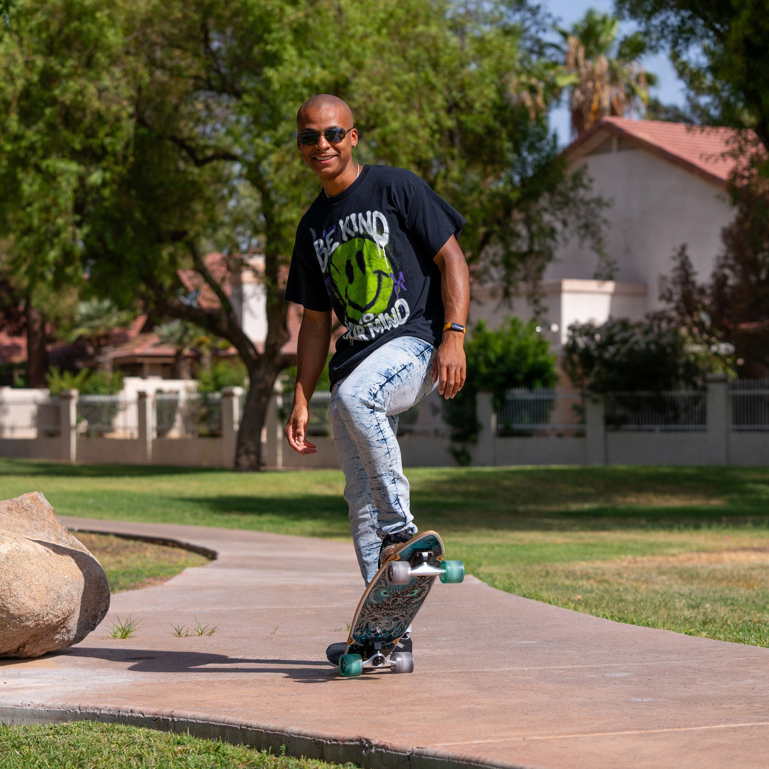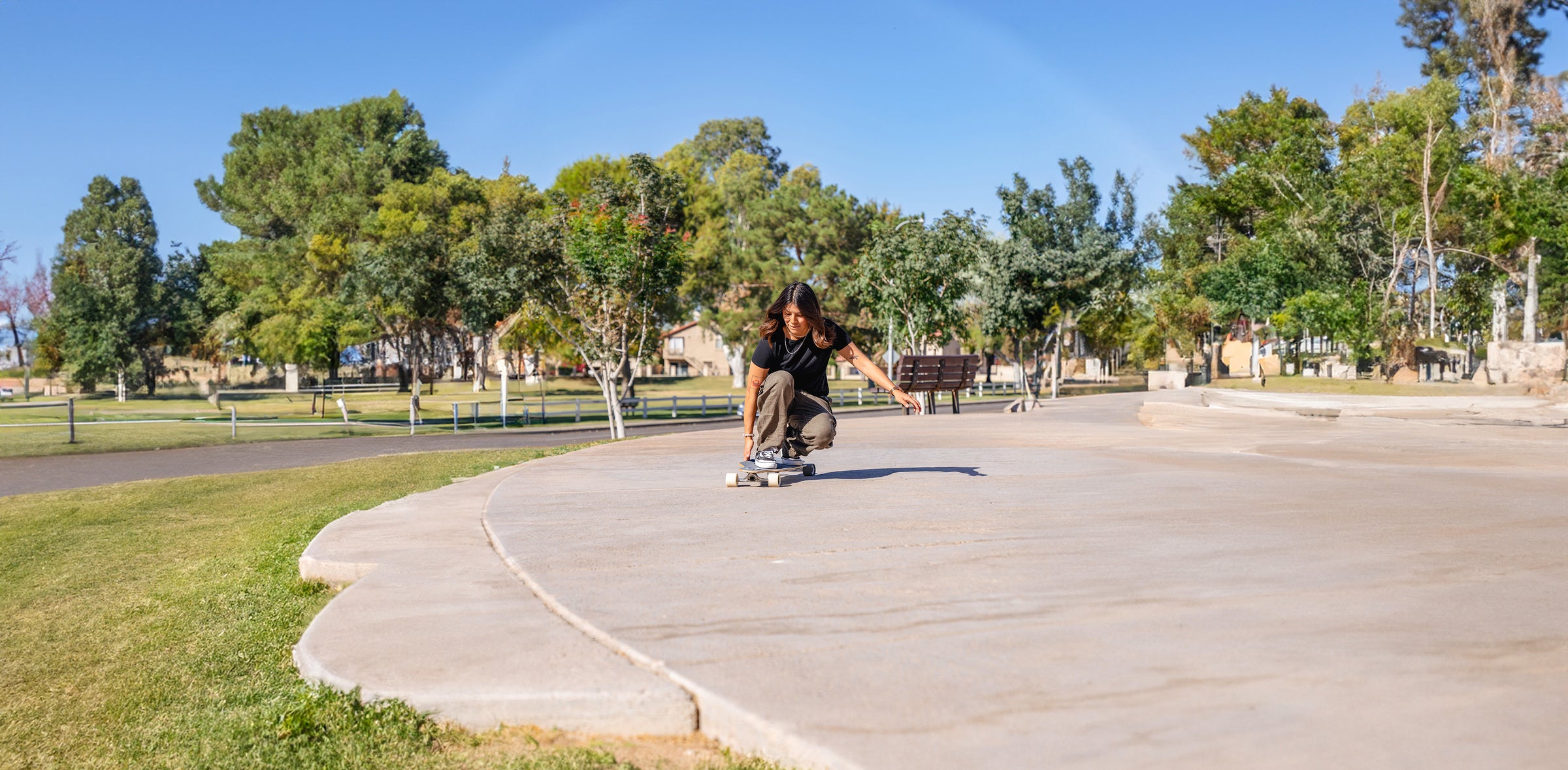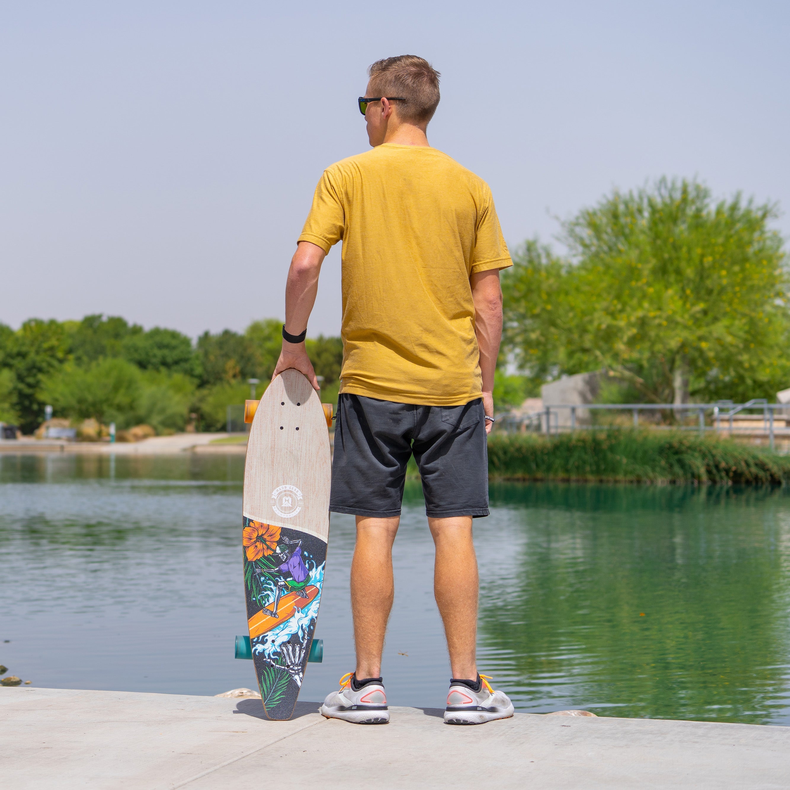Polyurethane wheels with high-speed bearings for smooth, stable rides.